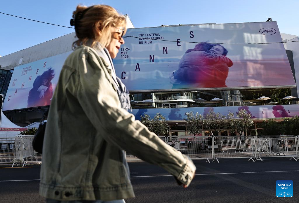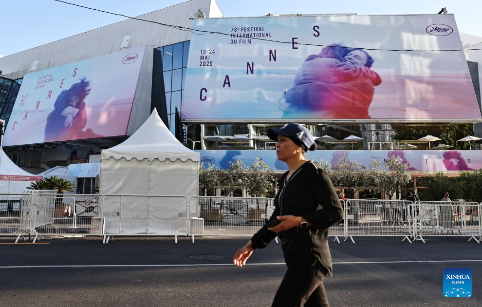 A man walks past the Palais du Festival in preparation for the Cannes Film Festival in Cannes, southern France, May 12, 2025. The 78th Cannes International Film Festival runs from May 13 to 24. (Xinhua/Gao Jing)