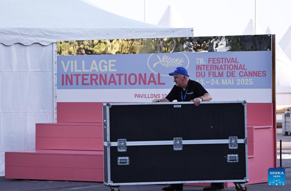 A staff member prepares for the Cannes International Film Festival in Cannes, southern France, May 12, 2025. The 78th Cannes International Film Festival runs from May 13 to 24. (Xinhua/Gao Jing)