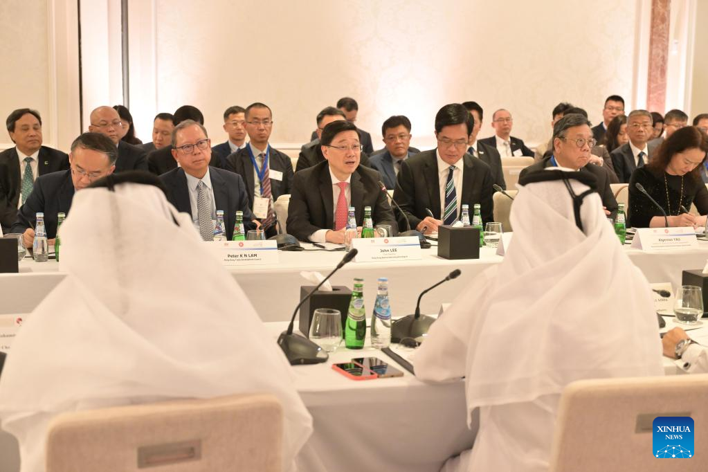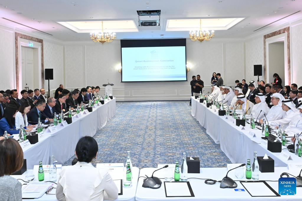 John Lee (3rd L), chief executive of the Hong Kong Special Administrative Region (HKSAR), attends a roundtable meeting with Qatar Chamber of Commerce and Industry in Doha, Qatar, May 12, 2025. Political and business leaders in Qatar on Monday expressed their keen interest in strengthening exchanges and enhancing trade and investment cooperation with the Hong Kong Special Administrative Region (HKSAR) of China. (Information Services Department of the Government of the HKSAR/Handout via Xinhua)