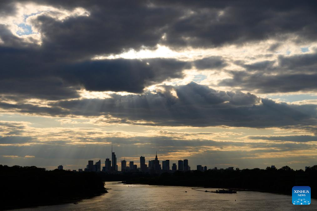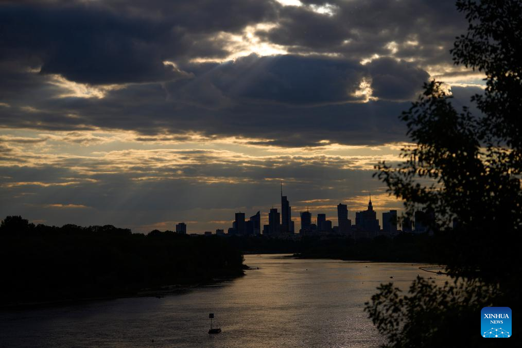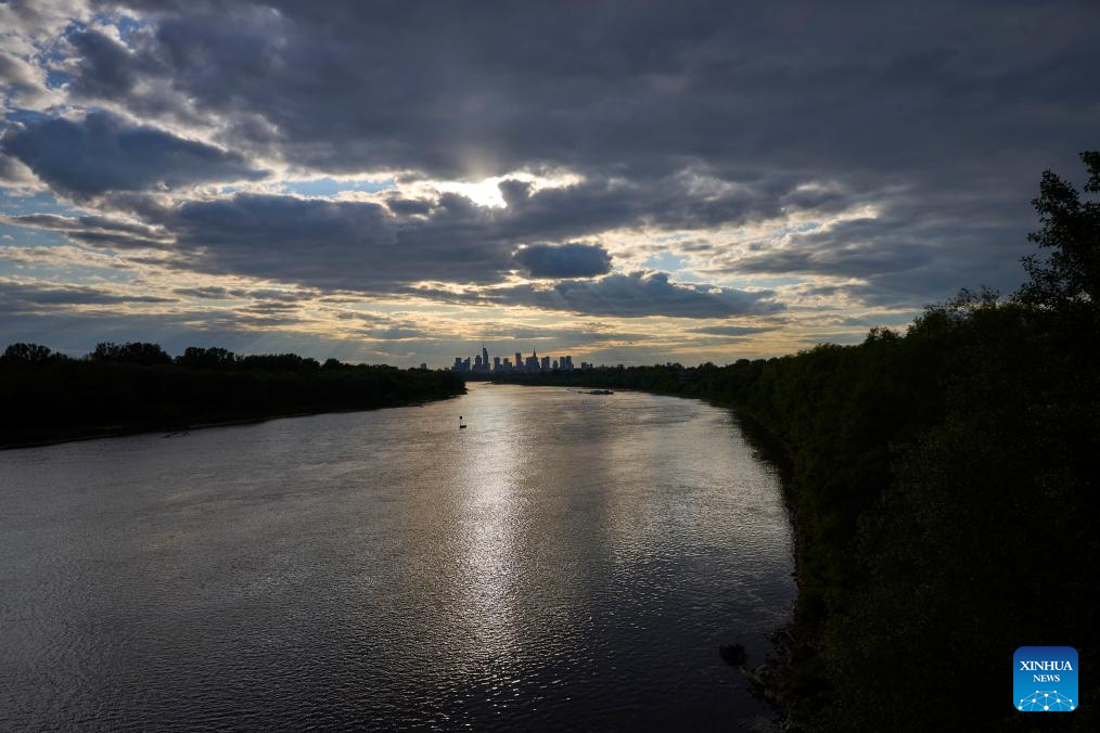 The sun sets over the city skyline as seen from a bridge spanning the Vistula River in Warsaw, Poland, on May 12, 2025. (Photo by Jaap Arriens/Xinhua)