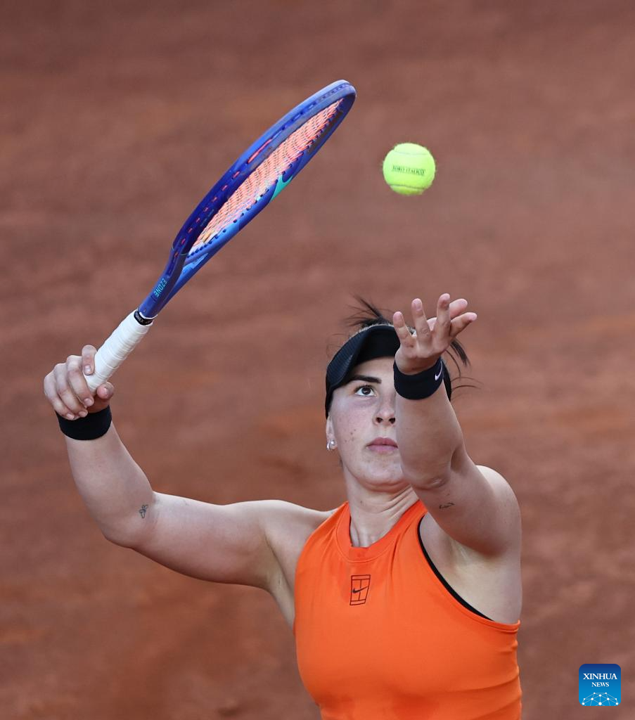Bianca Andreescu serves during the women's singles round of 16 match between Zheng Qinwen of China and Bianca Andreescu of Canada at the WTA Italian Open in Rome, Italy, May 12, 2025. (Xinhua/Li Jing)