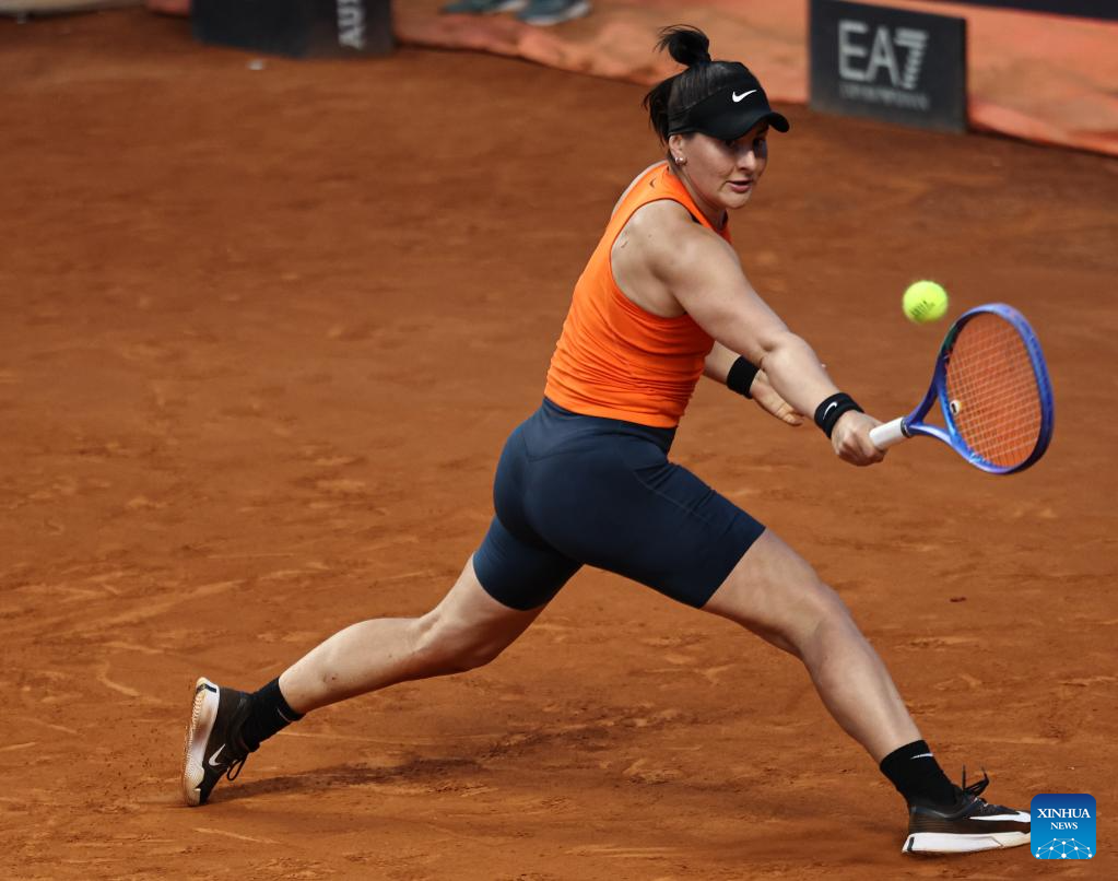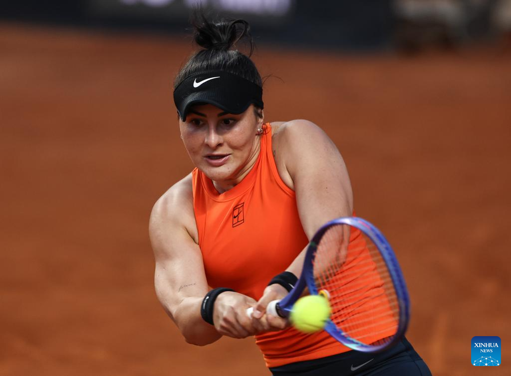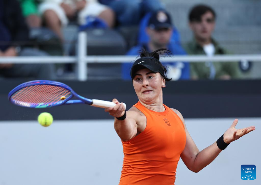Bianca Andreescu returns a shot during the women's singles round of 16 match between Zheng Qinwen of China and Bianca Andreescu of Canada at the WTA Italian Open in Rome, Italy, May 12, 2025. (Xinhua/Li Jing)
