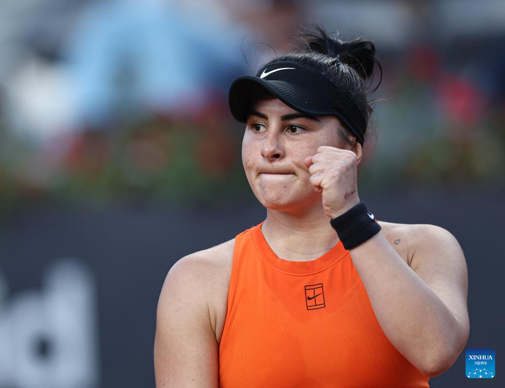 Bianca Andreescu celebrates a point during the women's singles round of 16 match between Zheng Qinwen of China and Bianca Andreescu of Canada at the WTA Italian Open in Rome, Italy, May 12, 2025. (Xinhua/Li Jing)