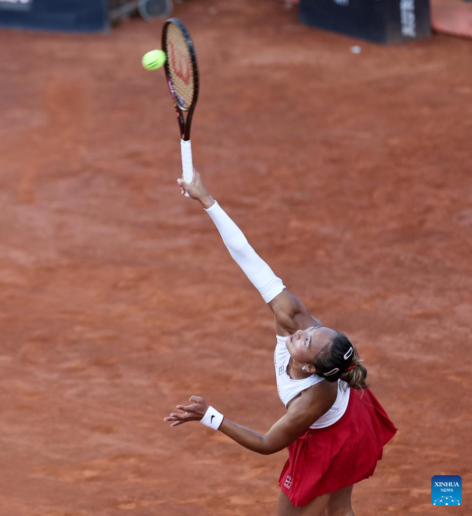 Zheng Qinwen serves during the women's singles round of 16 match between Zheng Qinwen of China and Bianca Andreescu of Canada at the WTA Italian Open in Rome, Italy, May 12, 2025. (Xinhua/Li Jing)