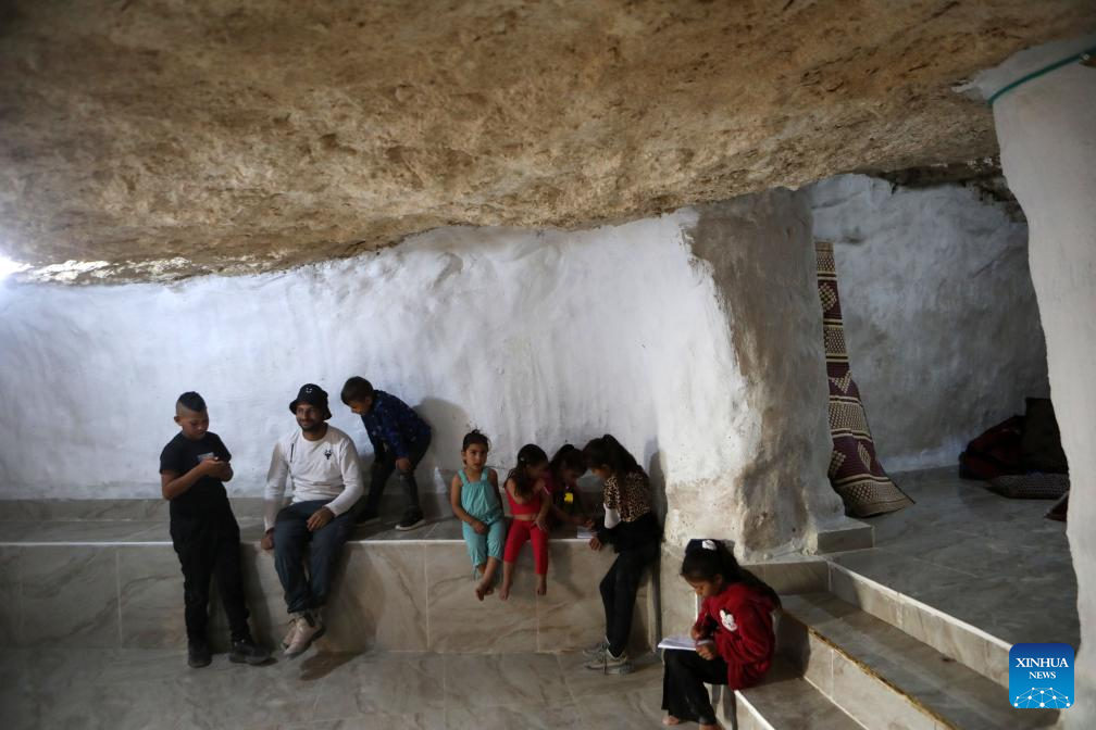 Palestinians are pictured inside a cave after the Israeli forces demolished their structures in the village of Khallet al-Dabaa in Masafer Yatta, southern West Bank city of Hebron, on May 12, 2025. (Photo by Mamoun Wazwaz/Xinhua)