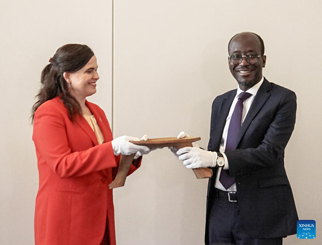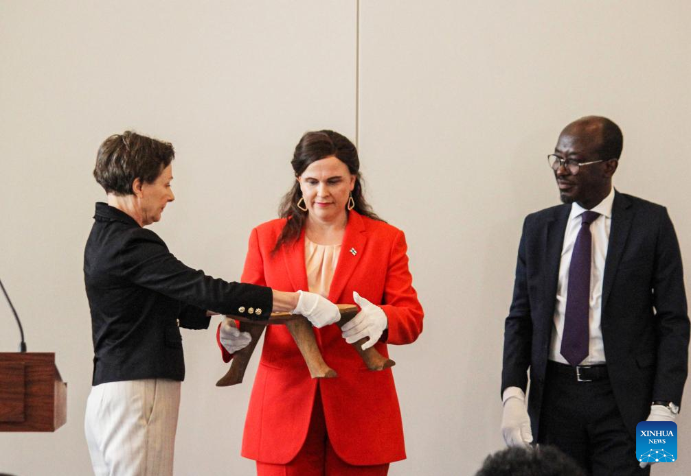 COTONOU, May 13 (Xinhua) -- Finnish Minister of Science and Culture Mari-Leena Talvitie officially handed over the Katakle -- a ceremonial royal stool from the Kingdom of Dahomey -- to Beninese Minister of Tourism, Culture and the Arts Jean-Michel Abimbola on Tuesday.