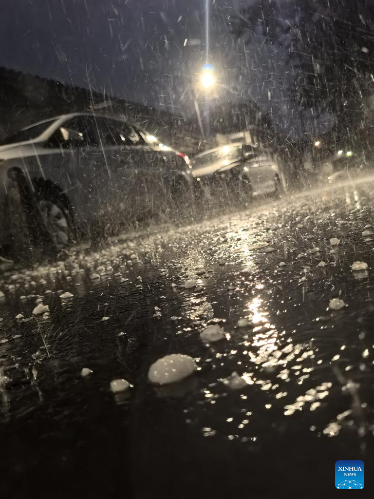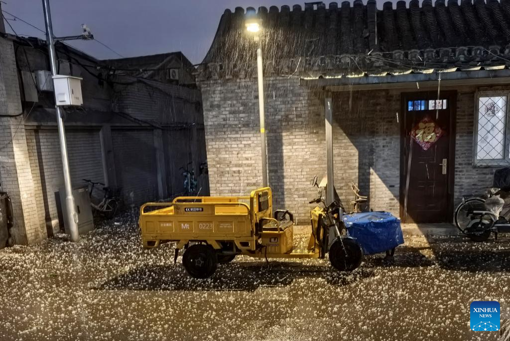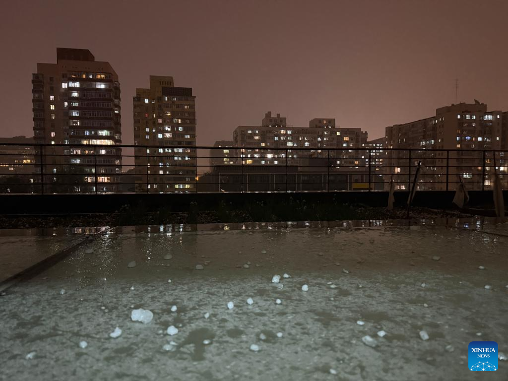 This photo taken on May 13, 2025 shows the hailstones in Xicheng District, Beijing, capital of China. Parts of Beijing saw strong winds and thunderstorms on Tuesday. (Xinhua/Li He)