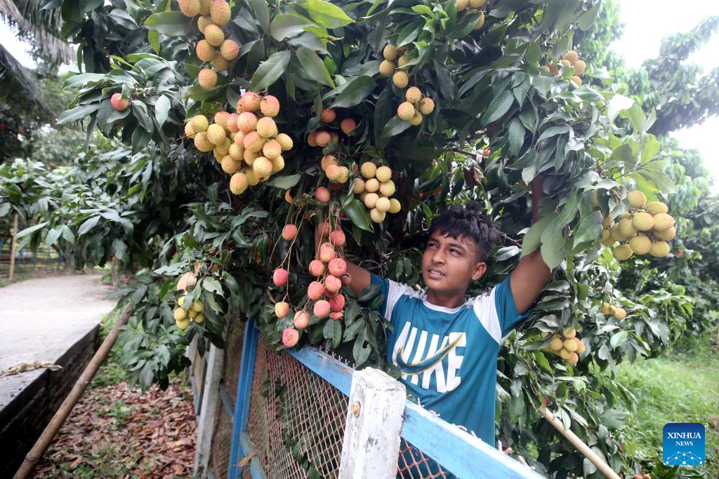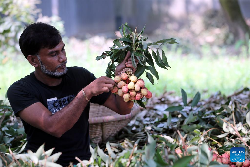 A farmer picks ripe lychees at a lychee garden in Narayanganj, Bangladesh on May 14, 2025. (Photo by Habibur Rahman/Xinhua)