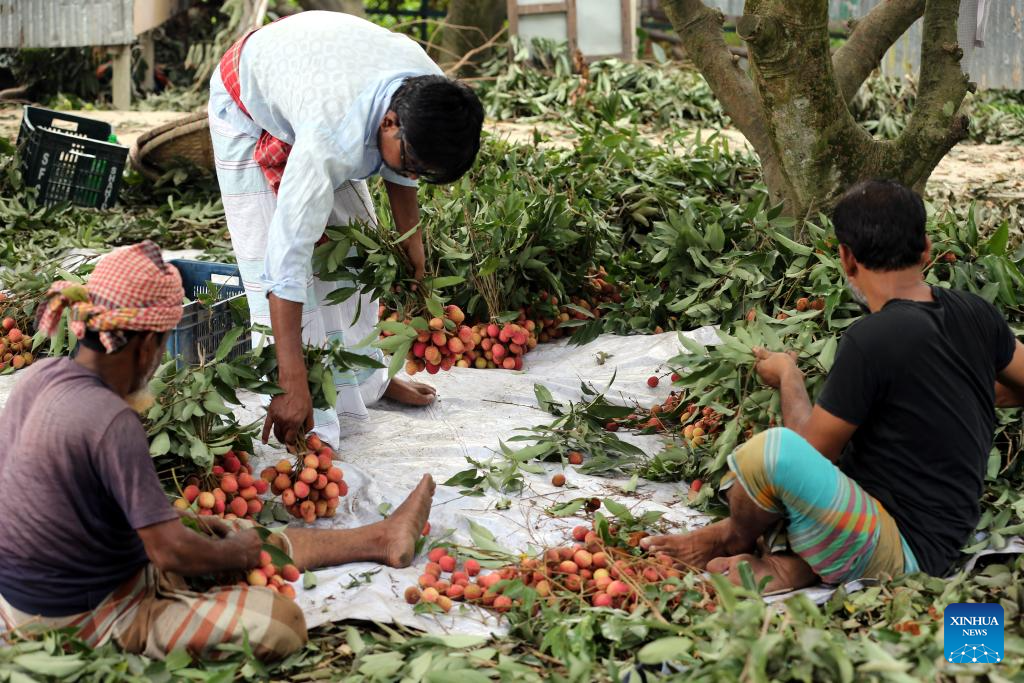 Farmers sort bundles of ripe lychees at a lychee garden in Narayanganj, Bangladesh on May 14, 2025. (Photo by Habibur Rahman/Xinhua)