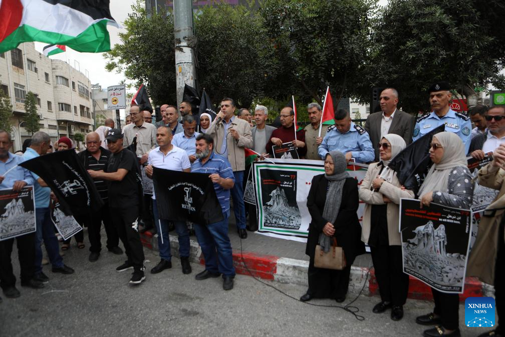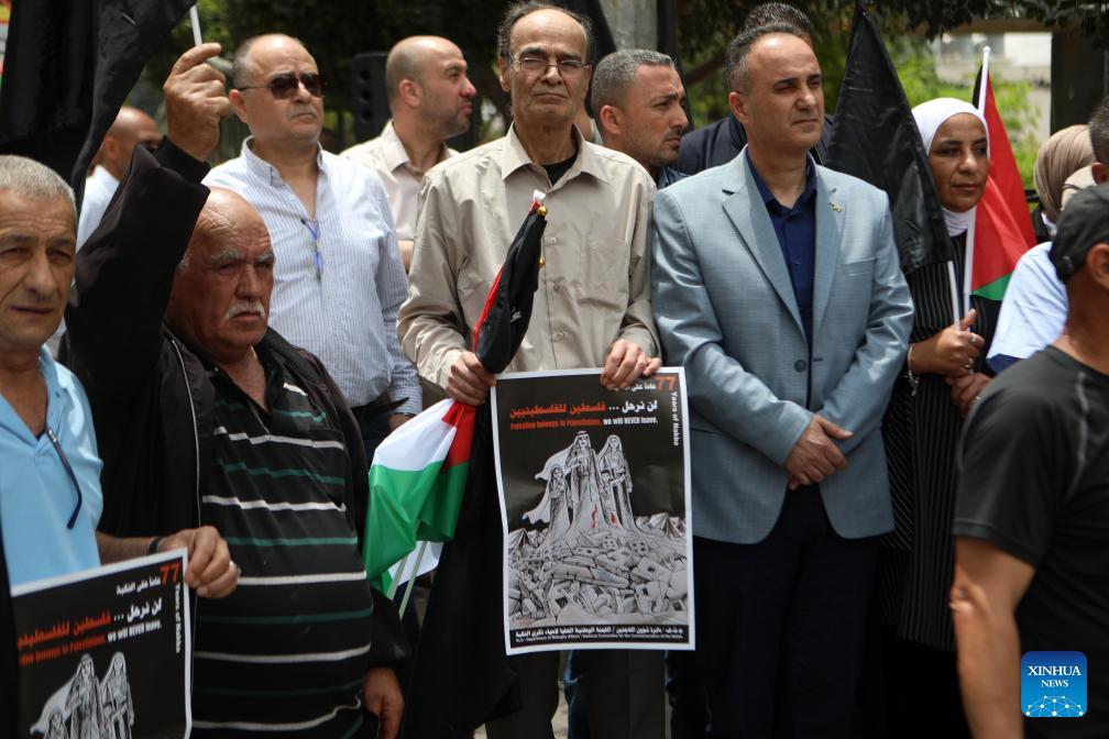 Palestinians participate in a public gathering to mark the 77th anniversary of Nakba in the southern West Bank city of Hebron, on May 14, 2025. Palestinians on Wednesday marked the 77th anniversary of Nakba, the massive exodus of Palestinians that occurred in 1948 following the establishment of the state of Israel. (Photo by Mamoun Wazwaz/Xinhua)