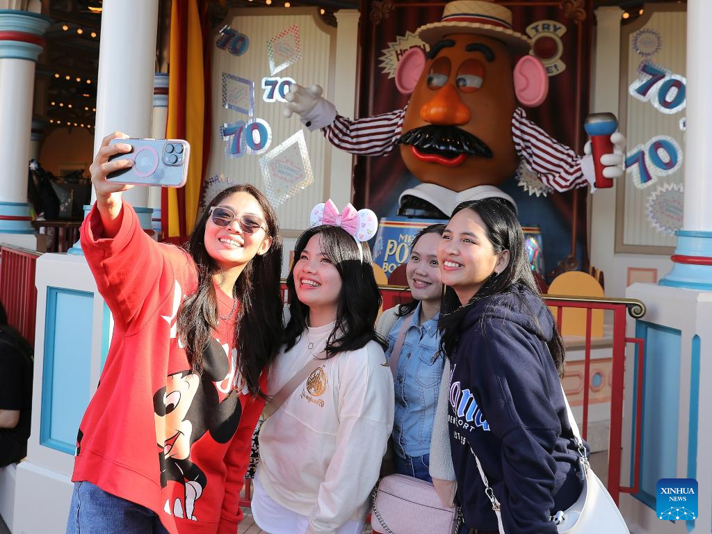 People pose for selfies at Disney California Adventure Park in Anaheim, California, the United States, on May 13, 2025. Disneyland Resort in U.S. California launches its 70th anniversary celebration this week with a host of special events, new attractions, vibrant decorations, themed food and beverages, and commemorative merchandise. (Photo by Qiu Chen/Xinhua)