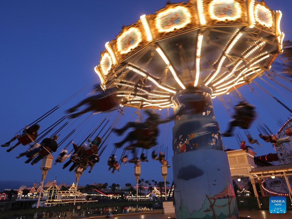 People ride on a swing carousel at Disney California Adventure Park in Anaheim, California, the United States, on May 13, 2025. Disneyland Resort in U.S. California launches its 70th anniversary celebration this week with a host of special events, new attractions, vibrant decorations, themed food and beverages, and commemorative merchandise. (Photo by Qiu Chen/Xinhua)