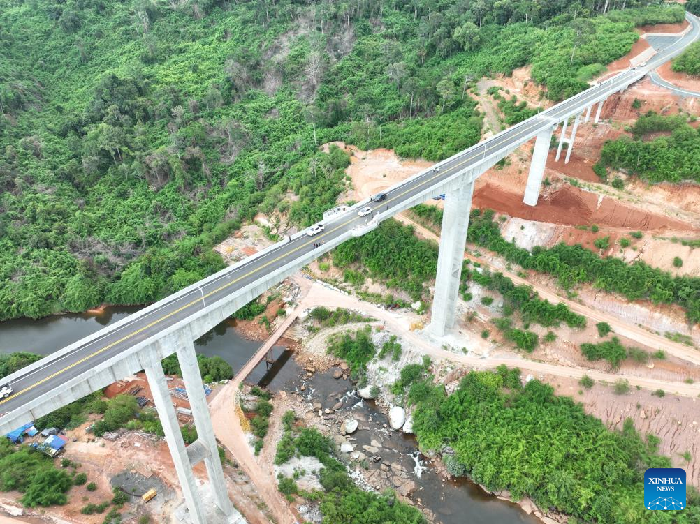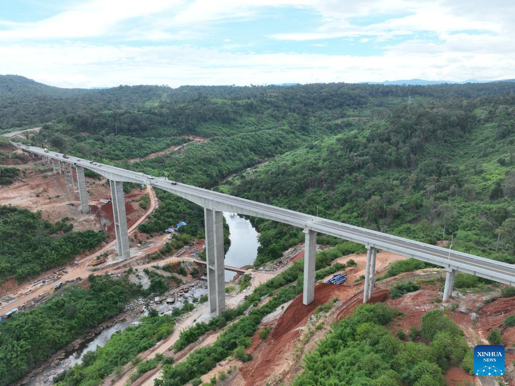 This undated aerial drone photo shows the Bridge No. 28 along National Road No. 10 in Pursat province, Cambodia. This bridge, the tallest of its kind in Cambodia, was built by a Chinese company in the country's western province of Pursat, and has been opened to traffic, an official said Friday. The 80-meter-tall bridge has a total length of 530 meters and a width of 10 meters. (China Road and Bridge Corporation/Handout via Xinhua)