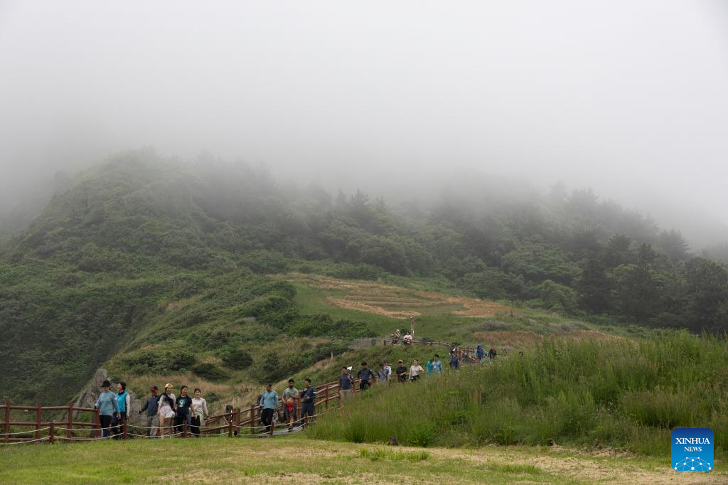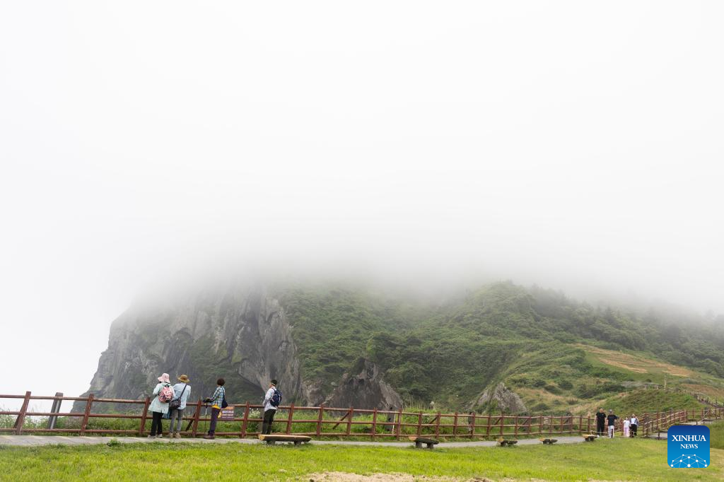 Tourists visit the Seongsan Ilchulbong peak on Jeju Island, South Korea, May 16, 2025. (Photo by Jun Hyosang/Xinhua)