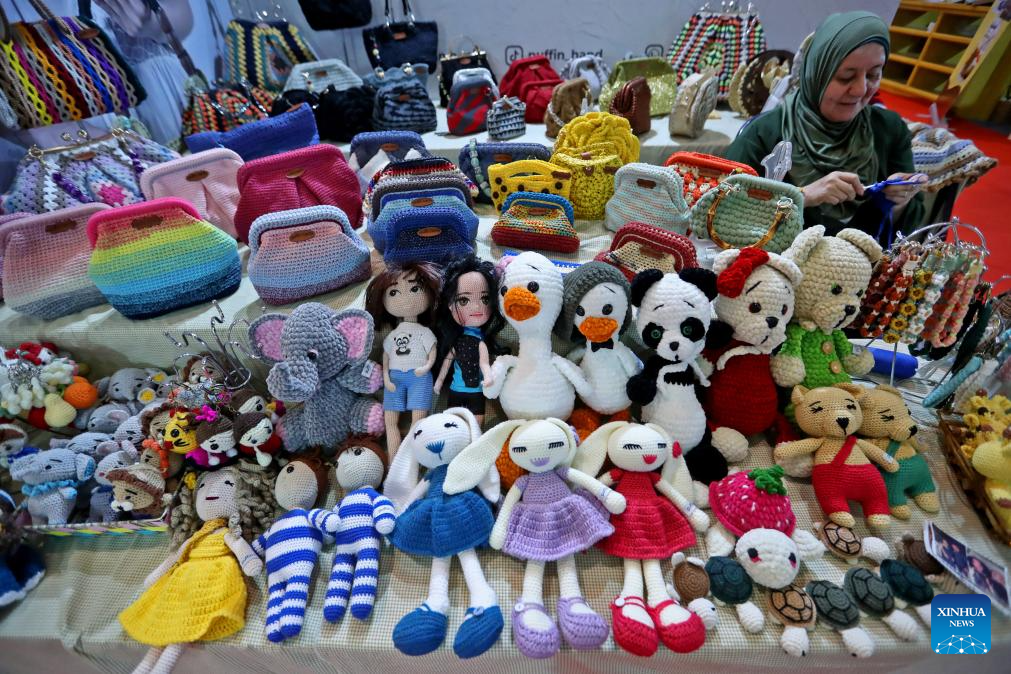 A woman displays products at the Made in Lebanon Exhibition 2025 in Beirut, Lebanon, on May 15, 2025. Held here from May 15 to 19, the Made in Lebanon Exhibition 2025 brings together over 350 exhibitors in an exhibition area of 14,000 square meters. (Xinhua/Bilal Jawich)