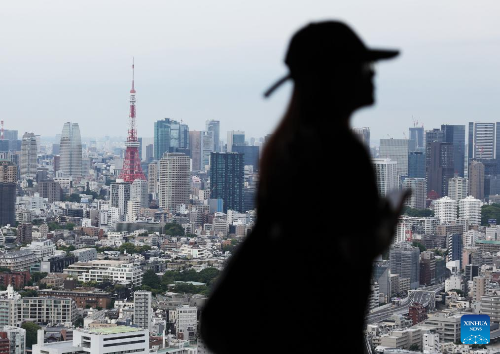 A visitors enjoys the city view from a high-rise building near Ebisu Station in Tokyo, Japan, May 15, 2025. Japan's economy contracted an annualized 0.7 percent in the first quarter of 2025, marking the first contraction in four quarters, government data showed Friday.