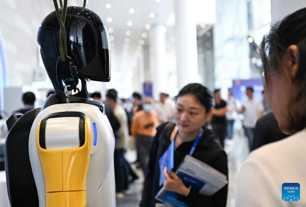 Visitors view a humanoid robot at the 20th Optics Valley of China International Optoelectronic Exposition (OVC Expo), at the China Optics Valley Convention and Exhibition Center in Wuhan, central China's Hubei Province, on May 16, 2025. Starting on Friday for three days with more than 20 conferences and special events scheduled, the OVC Expo is expected to attract nearly 400 exhibitors and over 30,000 professional visitors, including many well-known domestic and foreign companies in the field of optoelectronic industry. The exhibition areas at the expo feature the cutting-edge technologies such as lasers, precision optics, "optics plus robot", etc., aiming to showcase the growth opportunities in the optoelectronic industry. (Xinhua/Du Zixuan)
