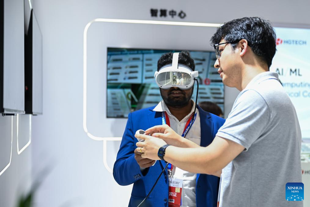 A visitor experiences a VR device at the 20th Optics Valley of China International Optoelectronic Exposition (OVC Expo), at the China Optics Valley Convention and Exhibition Center in Wuhan, central China's Hubei Province, on May 16, 2025. Starting on Friday for three days with more than 20 conferences and special events scheduled, the OVC Expo is expected to attract nearly 400 exhibitors and over 30,000 professional visitors, including many well-known domestic and foreign companies in the field of optoelectronic industry. The exhibition areas at the expo feature the cutting-edge technologies such as lasers, precision optics, "optics plus robot", etc., aiming to showcase the growth opportunities in the optoelectronic industry. (Xinhua/Du Zixuan)