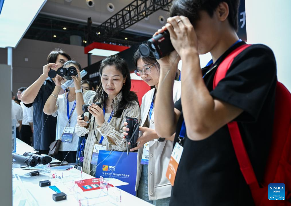 Visitors try infrared telescopes at the 20th Optics Valley of China International Optoelectronic Exposition (OVC Expo), at the China Optics Valley Convention and Exhibition Center in Wuhan, central China's Hubei Province, on May 16, 2025. Starting on Friday for three days with more than 20 conferences and special events scheduled, the OVC Expo is expected to attract nearly 400 exhibitors and over 30,000 professional visitors, including many well-known domestic and foreign companies in the field of optoelectronic industry. The exhibition areas at the expo feature the cutting-edge technologies such as lasers, precision optics, "optics plus robot", etc., aiming to showcase the growth opportunities in the optoelectronic industry. (Xinhua/Du Zixuan)