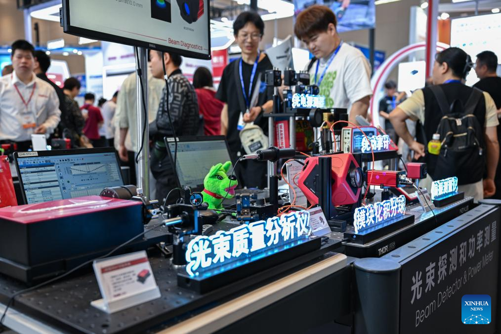 Visitors view a beam detector and power meter at the 20th Optics Valley of China International Optoelectronic Exposition (OVC Expo), at the China Optics Valley Convention and Exhibition Center in Wuhan, central China's Hubei Province, on May 16, 2025. Starting on Friday for three days with more than 20 conferences and special events scheduled, the OVC Expo is expected to attract nearly 400 exhibitors and over 30,000 professional visitors, including many well-known domestic and foreign companies in the field of optoelectronic industry. The exhibition areas at the expo feature the cutting-edge technologies such as lasers, precision optics, "optics plus robot", etc., aiming to showcase the growth opportunities in the optoelectronic industry. (Xinhua/Du Zixuan)