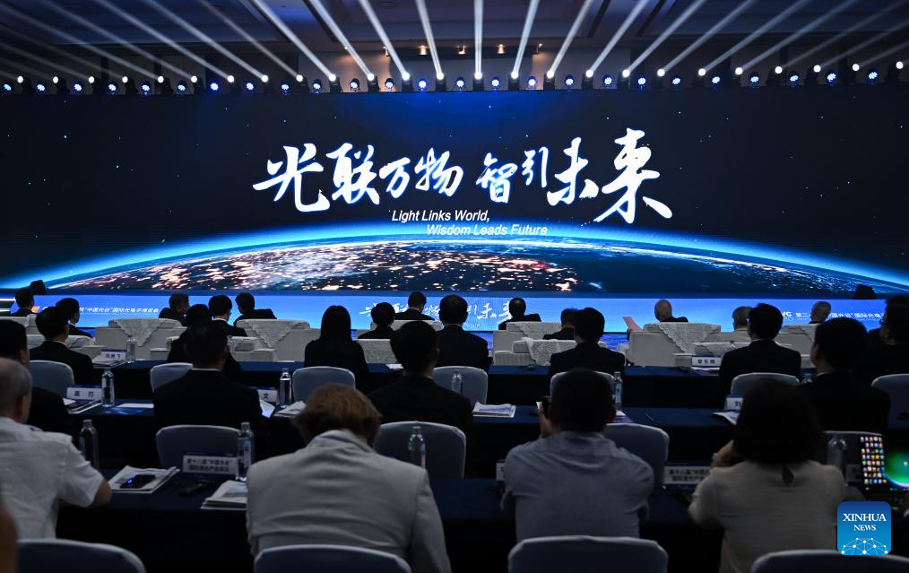 This photo taken on May 16, 2025 shows the opening ceremony of the 20th Optics Valley of China International Optoelectronic Exposition (OVC Expo), at the China Optics Valley Convention and Exhibition Center in Wuhan, central China's Hubei Province. Starting on Friday for three days with more than 20 conferences and special events scheduled, the OVC Expo is expected to attract nearly 400 exhibitors and over 30,000 professional visitors, including many well-known domestic and foreign companies in the field of optoelectronic industry. The exhibition areas at the expo feature the cutting-edge technologies such as lasers, precision optics, "optics plus robot", etc., aiming to showcase the growth opportunities in the optoelectronic industry. (Xinhua/Du Zixuan)