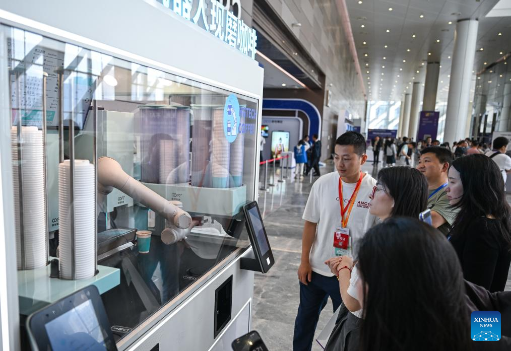 Visitors buy coffee served by a robot at the 20th Optics Valley of China International Optoelectronic Exposition (OVC Expo), at the China Optics Valley Convention and Exhibition Center in Wuhan, central China's Hubei Province, on May 16, 2025. Starting on Friday for three days with more than 20 conferences and special events scheduled, the OVC Expo is expected to attract nearly 400 exhibitors and over 30,000 professional visitors, including many well-known domestic and foreign companies in the field of optoelectronic industry. The exhibition areas at the expo feature the cutting-edge technologies such as lasers, precision optics, "optics plus robot", etc., aiming to showcase the growth opportunities in the optoelectronic industry. (Xinhua/Du Zixuan)