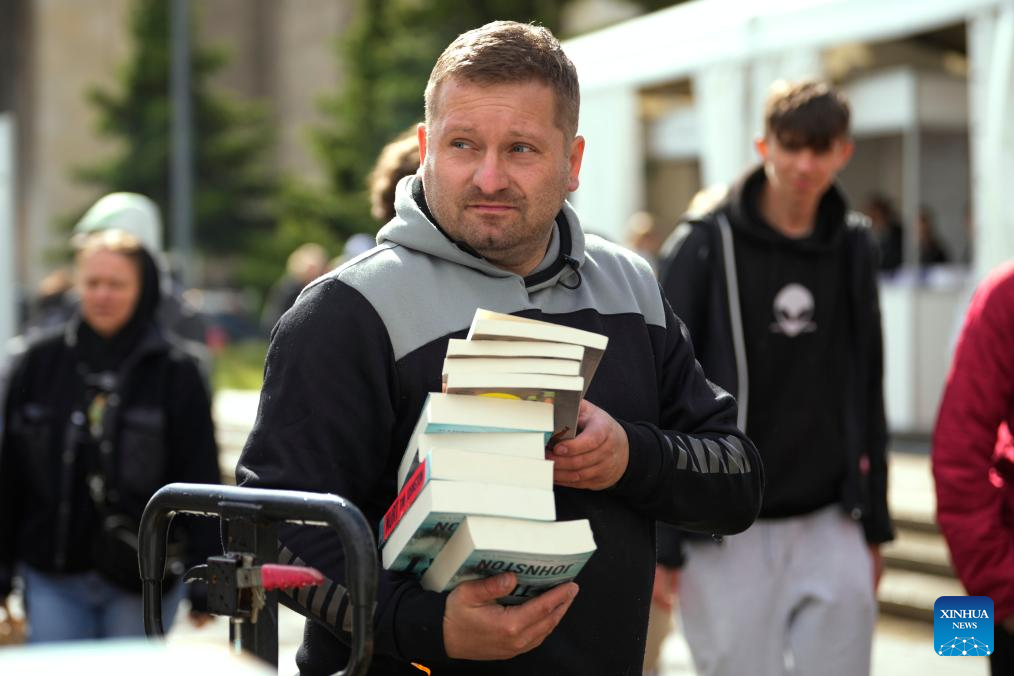 A man buys books at the 2025 Warsaw International Book Fair in Warsaw, Poland, May 15, 2025. The event held here on May 15-18 has drawn over 620 publishers from 20 countries and regions. (Photo by Jaap Arriens/Xinhua)