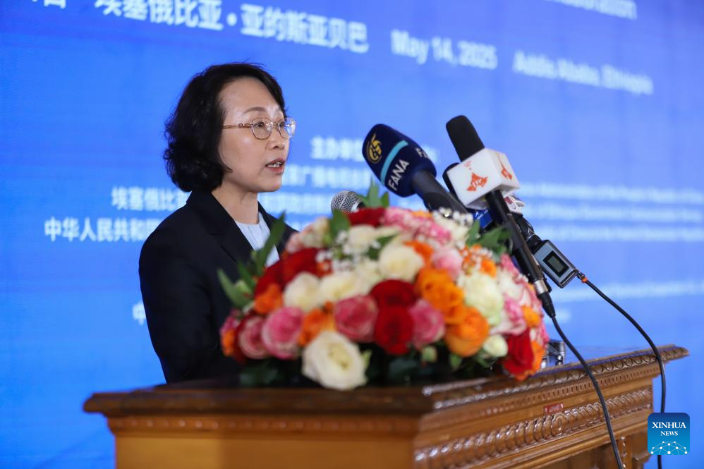 Cao Shumin, director of the National Radio and Television Administration of China, speaks at a high-level forum under the theme "Seeing China: Fostering China-Ethiopia Media Collaboration" in Addis Ababa, Ethiopia, on May 14, 2025. Chinese and Ethiopian media outlets have underscored the importance of deepening cooperation to enhance mutual understanding and strengthen people-to-people ties. (Xinhua/Michael Tewelde)