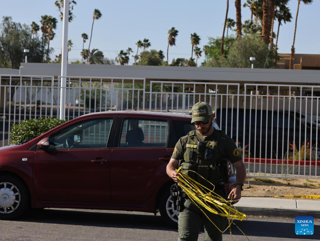 A local sheriff deputy keeps guard near the site of an explosion in Palm Springs, California, the United States, on May 17, 2025. At least one person was killed and five others injured on Saturday in an explosion outside a fertility clinic in the desert resort city of Palm Springs, California, according to authorities. (Photo by Qiu Chen/Xinhua)