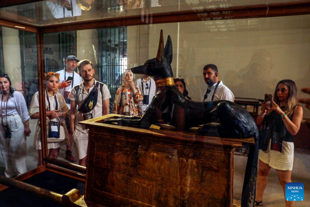 Visitors view a mummy coffin at the Egyptian Museum in Cairo, Egypt, May 18, 2025. International Museum Day, observed every year on May 18, is a global celebration recognized by the International Council of Museums. (Xinhua/Ahmed Gomaa)