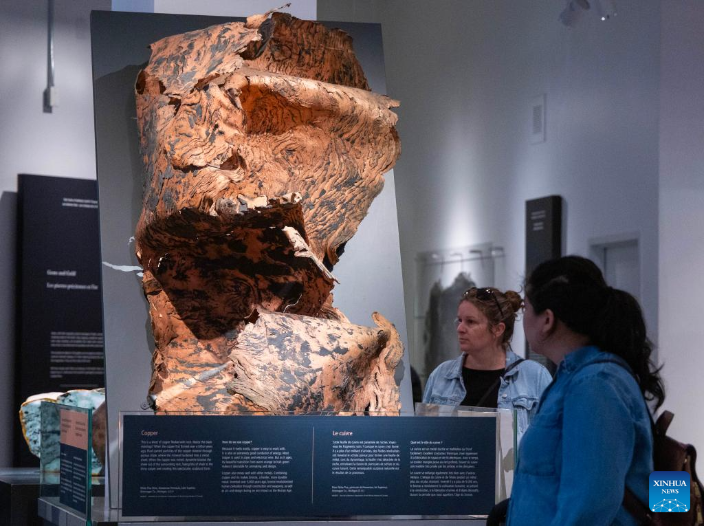 Visitors look at a sheet of copper flecked with rock at the Royal Ontario Museum in Toronto, Canada, May 18, 2025.