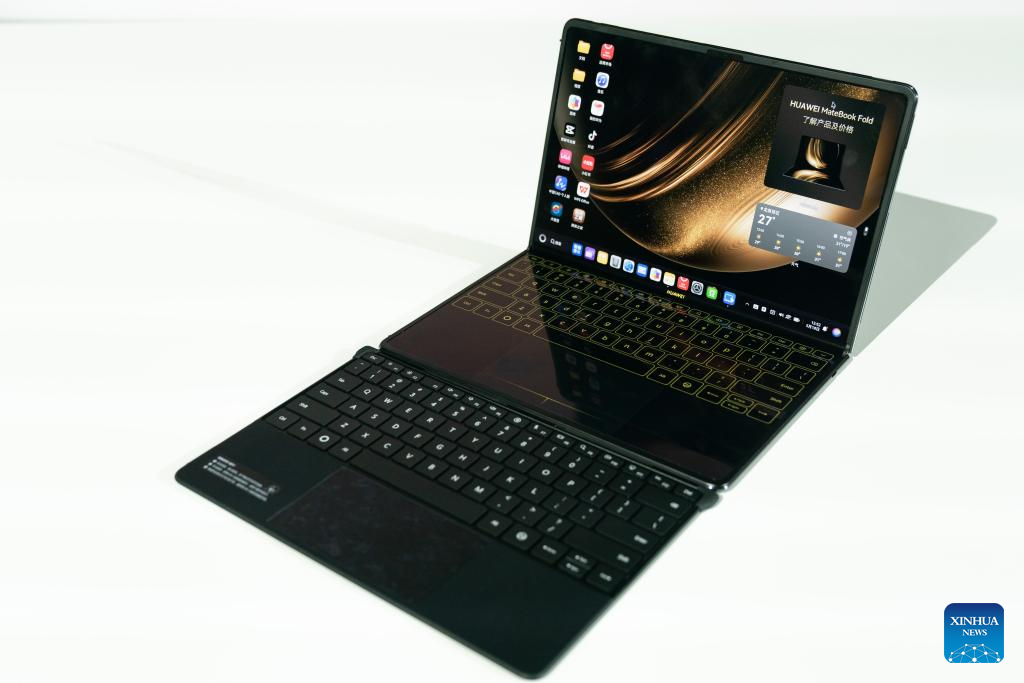 This photo shows the HarmonyOS-powered Huawei MateBook Pro. Chinese tech giant Huawei on Monday unveiled two laptops powered by HarmonyOS, marking the debut of its self-developed operating system on personal computers (PCs). The launch of the Huawei MateBook Pro and MateBook Fold Ultimate Design signals the company's push to expand HarmonyOS beyond smartphones and tablets into a PC market long led by Microsoft's Windows and Apple's macOS. (Xinhua/Xu Bingjie)