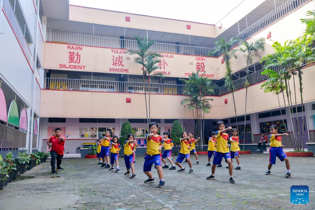 A teacher guides students to practice martial arts at the primary school campus of Puhua School in Purwokerto, Central Java, Indonesia, May 16, 2025. (Xinhua/Xu Qin)