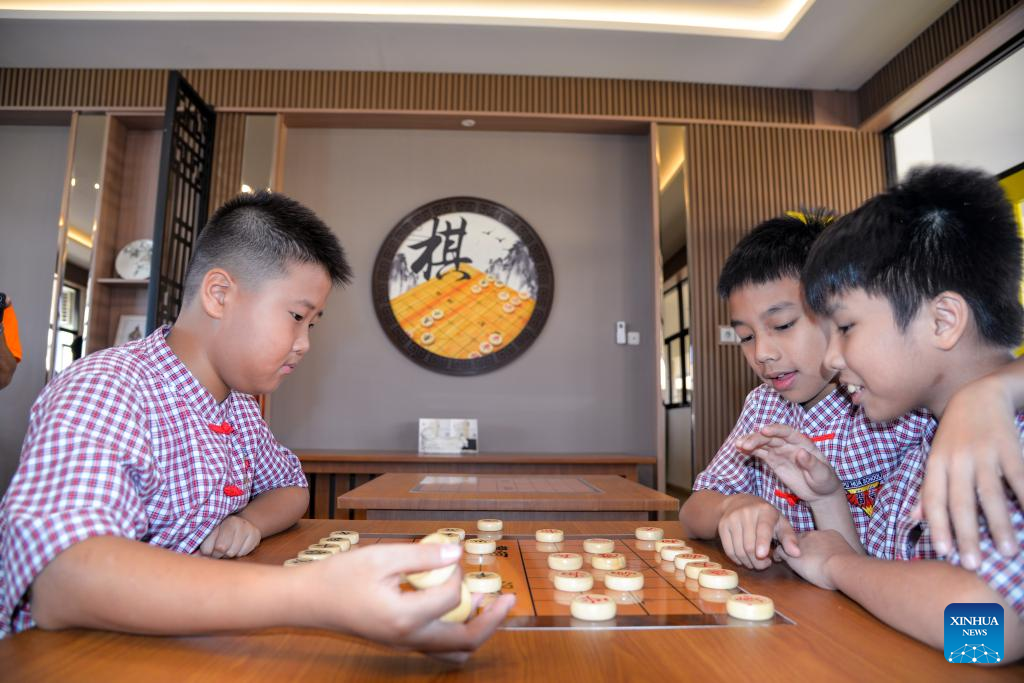 The sixth-grade students play Xiangqi, a Chinese chess game, at the Confucius Classroom in the primary school campus of Puhua School in Purwokerto, Central Java, Indonesia, May 16, 2025. (Xinhua/Xu Qin)