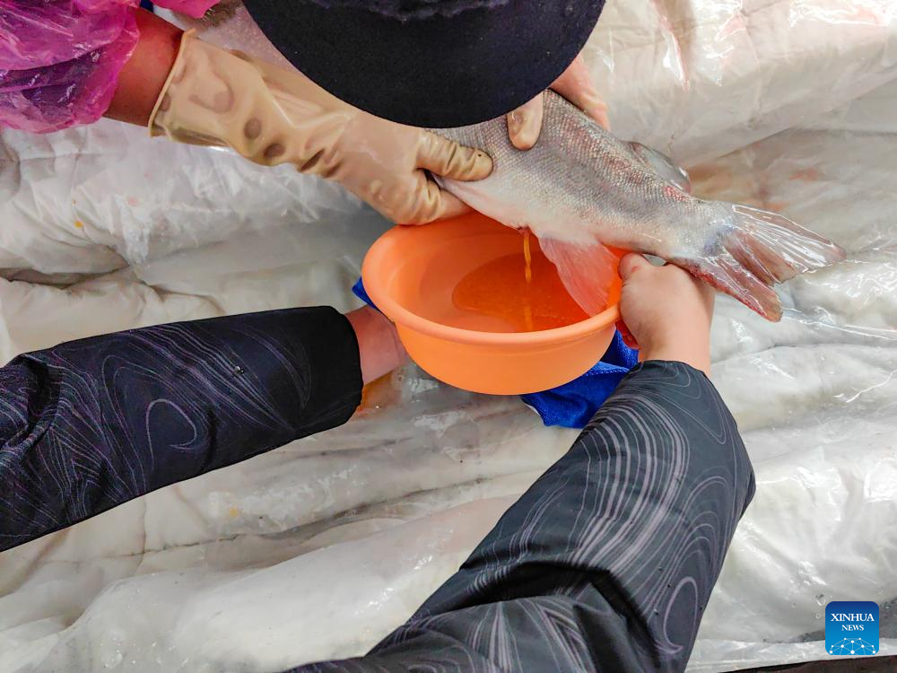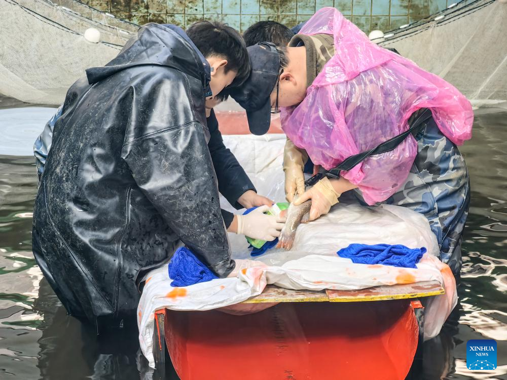 Researchers collect eggs of first-filial-generation Sichuan taimen at a fish proliferation and release station operated by a company under PowerChina Hydropower Development Group Co., Ltd. in Barkam City of Aba Tibetan and Qiang Autonomous Prefecture, southwest China's Sichuan Province, March 2, 2025.