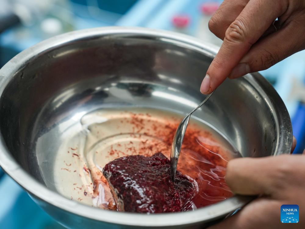 A researcher thaws feed for second-filial-generation Sichuan taimen at a fish proliferation and release station operated by a company under PowerChina Hydropower Development Group Co., Ltd. in Barkam City of Aba Tibetan and Qiang Autonomous Prefecture, southwest China's Sichuan Province, May 18, 2025.