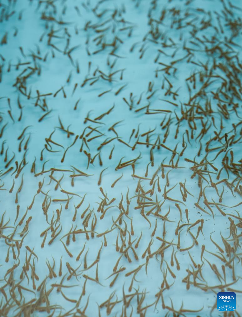 The photo shows the fry of second-filial-generation Sichuan taimen at a fish proliferation and release station operated by a company under PowerChina Hydropower Development Group Co., Ltd. in Barkam City of Aba Tibetan and Qiang Autonomous Prefecture, southwest China's Sichuan Province, May 18, 2025.