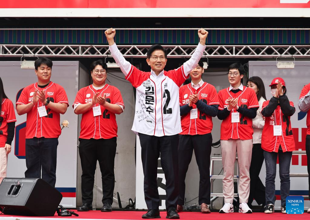Kim Moon-soo (C), presidential candidate of People Power Party, speaks during an election campaign in Seoul, South Korea, May 19, 2025. (Photo by Jun Hyosang/Xinhua)