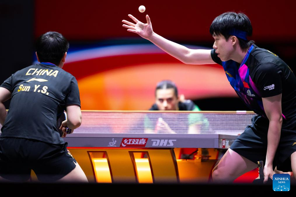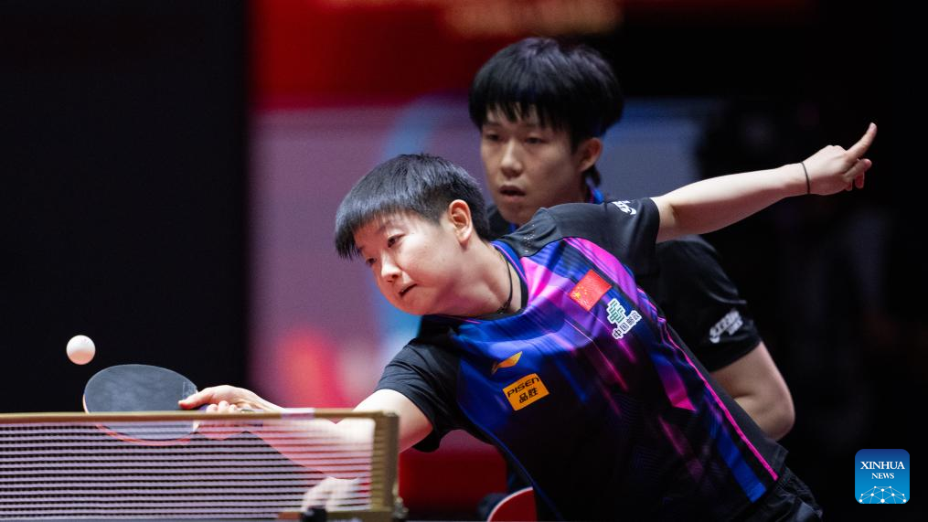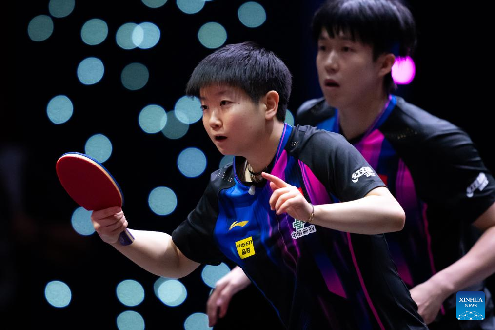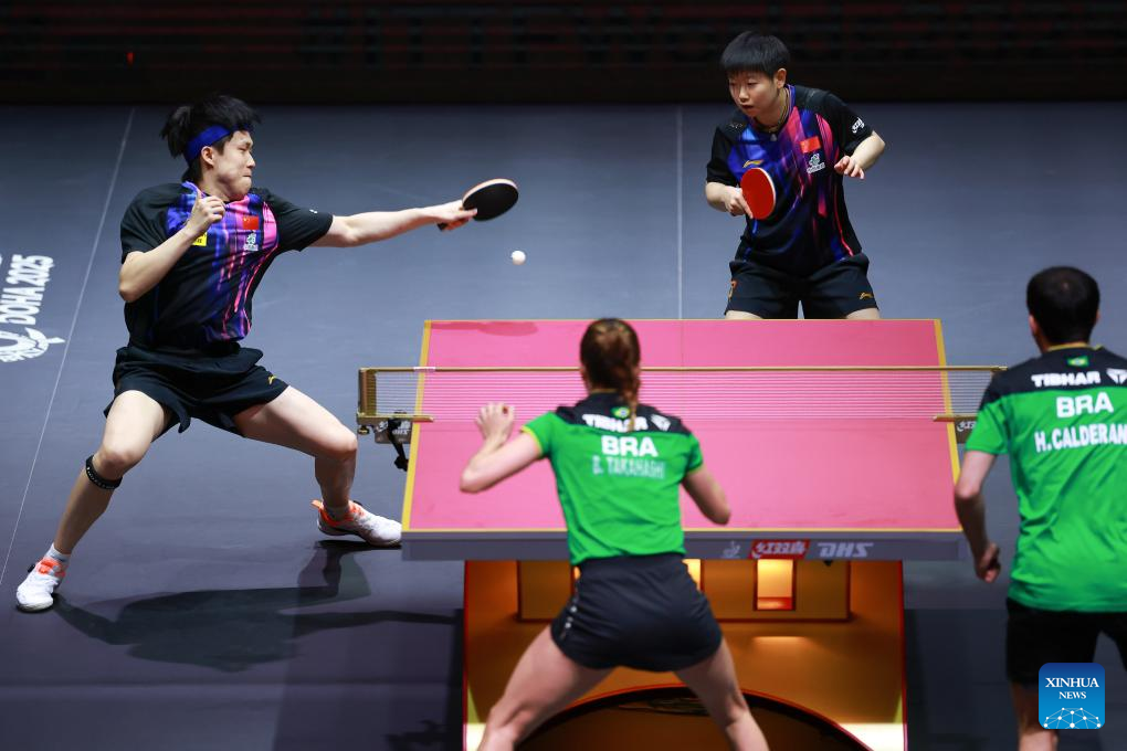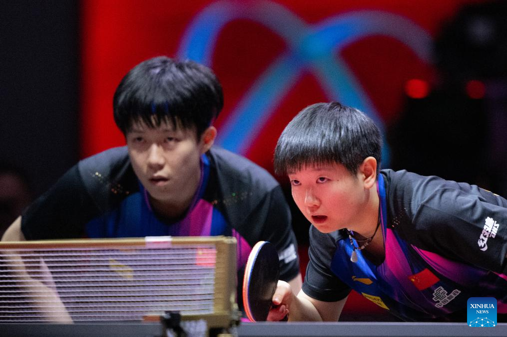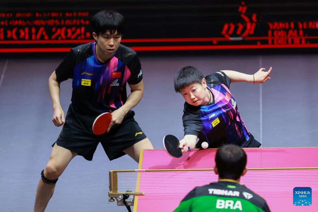 Wang Chuqin/Sun Yingsha (front) of China compete against Hugo Calderano/Bruna Takahashi of Brazil during the mixed doubles round of 32 match at ITTF World Table Tennis Championships Finals Doha 2025 in Doha, Qatar, May 19, 2025. (Xinhua/Xiao Yijiu)