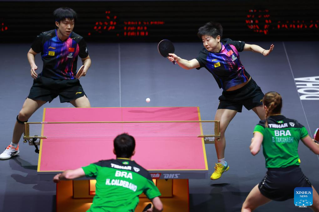Wang Chuqin (top L)/Sun Yingsha (top R) of China compete against Hugo Calderano/Bruna Takahashi of Brazil during the mixed doubles round of 32 match at ITTF World Table Tennis Championships Finals Doha 2025 in Doha, Qatar, May 19, 2025. (Xinhua/Liu Xu)