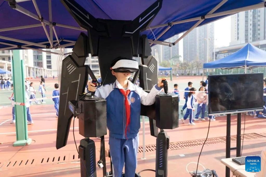 A student operates an AI-powered VR device at Shenzhen Xiantian Foreign Language School in south China's Guangdong Province, March 21, 2025. (Xinhua)