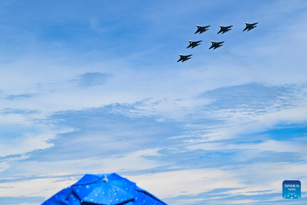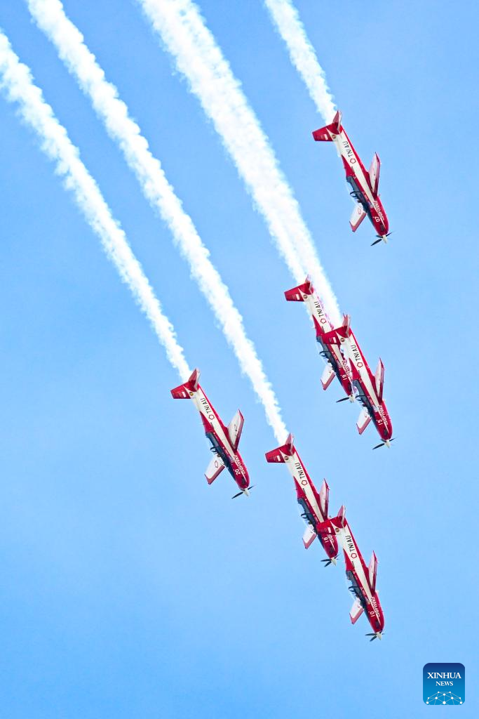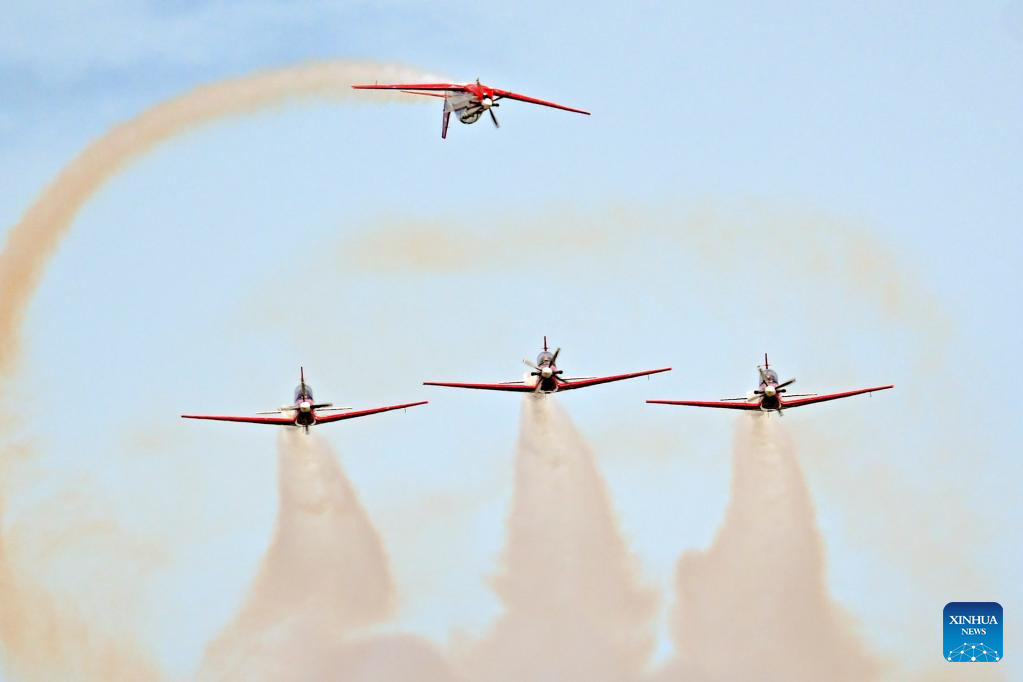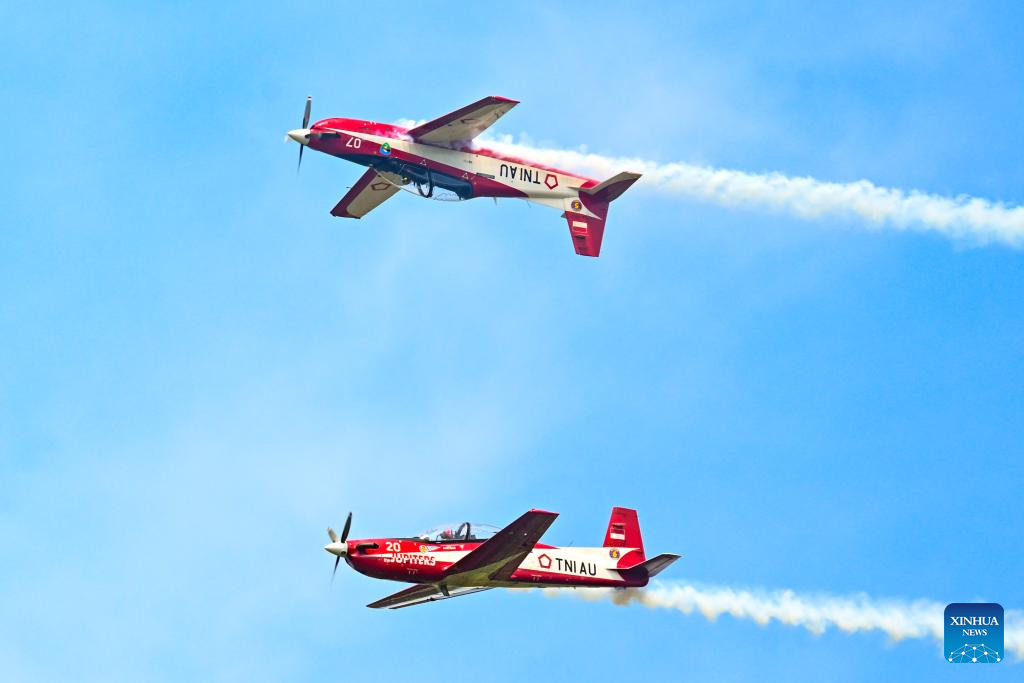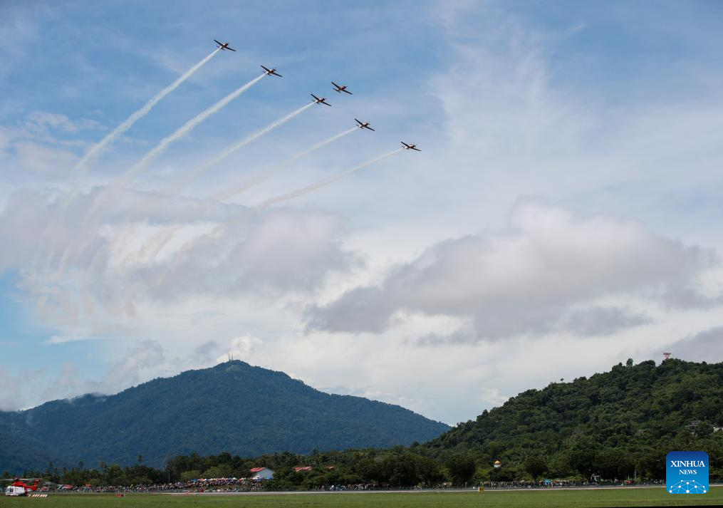 Jupiter Aerobatic Team performs an aerobatic show at the opening ceremony of the 17th edition of the Langkawi International Maritime and Aerospace Exhibition (LIMA) in Langkawi, Malaysia, May 20, 2025. (Xinhua/Ma Ping)