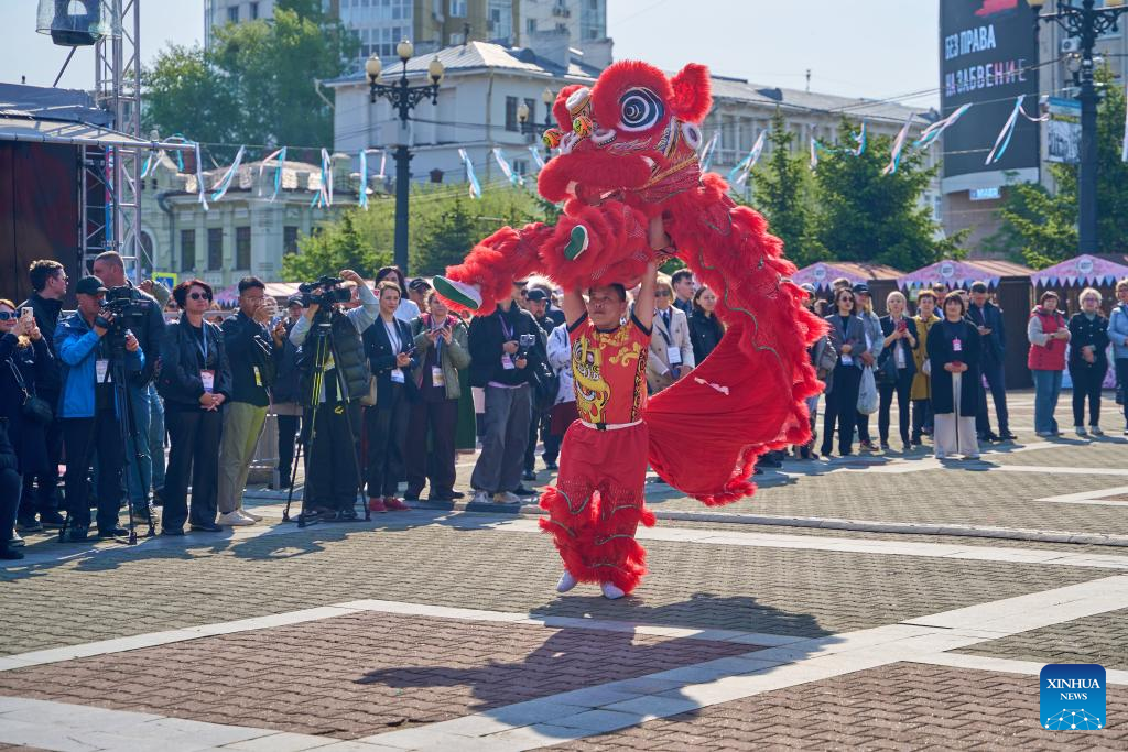 A lion dance is staged at the opening ceremony of the "Russia-China Forum" in Khabarovsk, Russia, May 19, 2025. The two-day "Russia-China Forum" opened on Monday in the Russian city of Khabarovsk, attracting more than 3,000 participants, including entrepreneurs, government officials, industry experts and scholars from both countries. (Photo by Guo Feizhou/Xinhua)