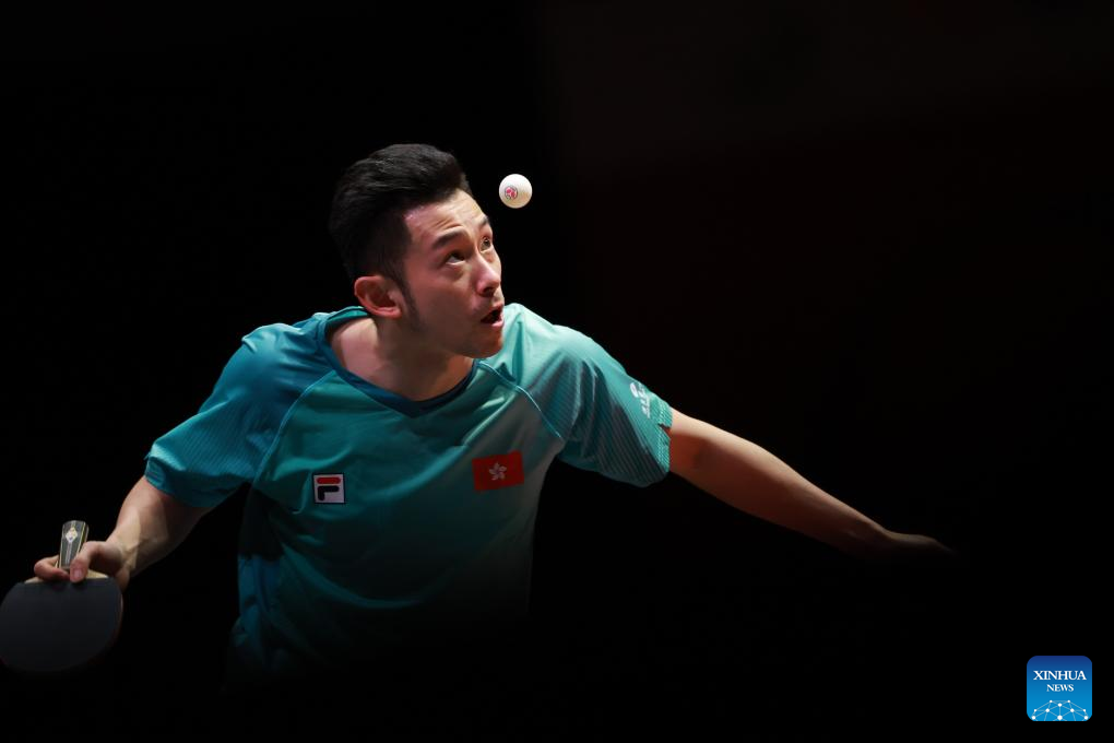 Wong Chun Ting serves during the men's singles round of 32 match between Wang Chuqin of China and Wong Chun Ting of China's Hong Kong at ITTF World Table Tennis Championships Finals Doha 2025 in Doha, Qatar, May 20, 2025. (Xinhua/Liu Xu)