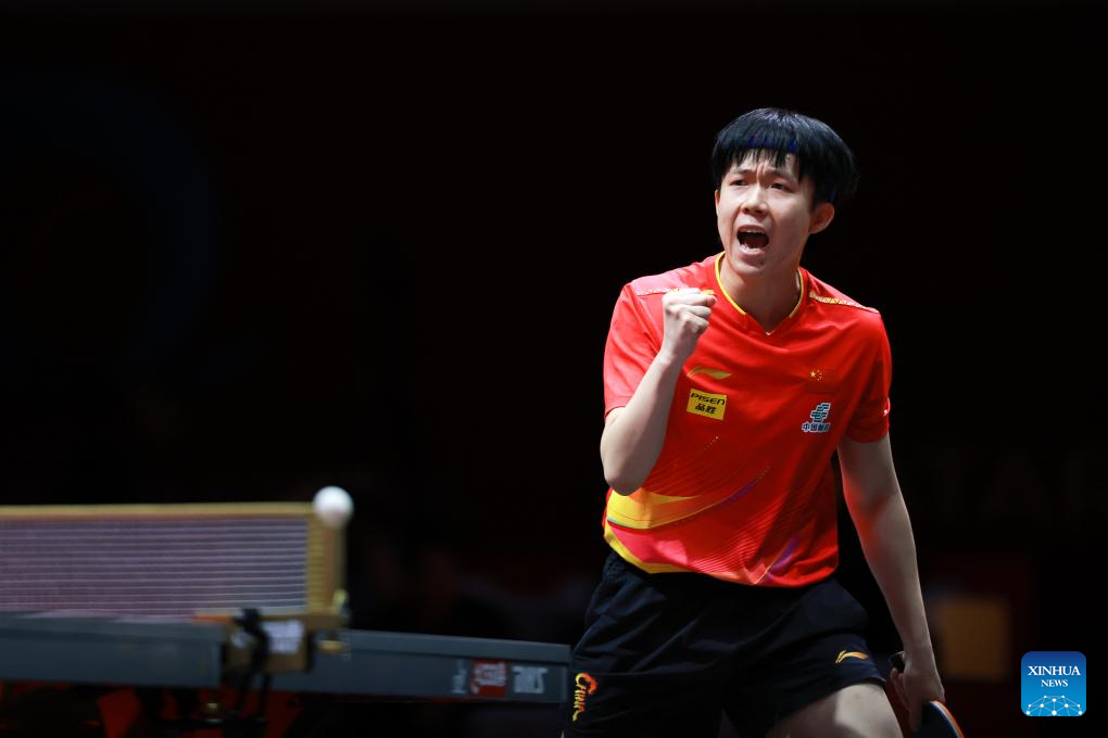 Wang Chuqin celebrates scoring during the men's singles round of 32 match between Wang Chuqin of China and Wong Chun Ting of China's Hong Kong at ITTF World Table Tennis Championships Finals Doha 2025 in Doha, Qatar, May 20, 2025. (Xinhua/Liu Xu)