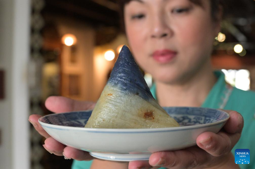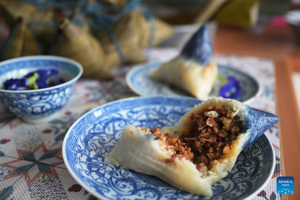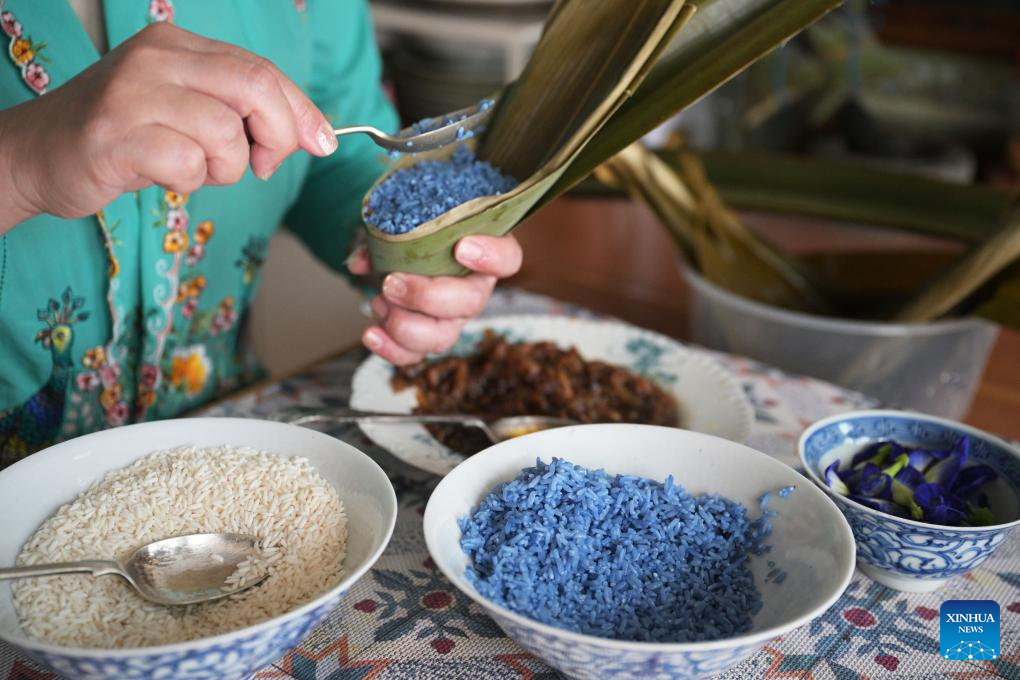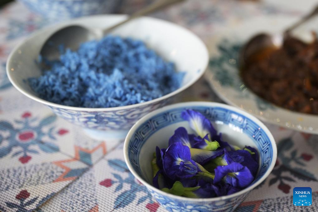 Nyonya rice dumplings are a representative dish of Nyonya cuisine. The use of blue glutinous rice is a highlight of this delicacy, dyed using natural pigments extracted from butterfly pea flowers. The Nyonya dumplings showcased at the Intan feature a filling made from stir-fried winter melon strips and minced pork marinated with spices, all wrapped in pandan leaves and bamboo leaves. (Xinhua/Then Chih Wey)