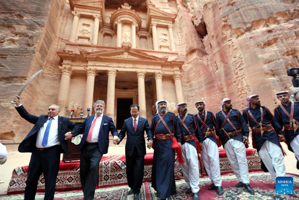 Guests and artists dance during the signing ceremony of an agreement on cooperation in culture and tourism between the Chinese city of Jiayuguan and the Jordanian city of Petra, at Petra, Jordan, on May 20, 2025. The agreement signed Tuesday seeks to strengthen the friendly ties between the two historical sites. (Photo by Mohammad Abu Ghosh/Xinhua)