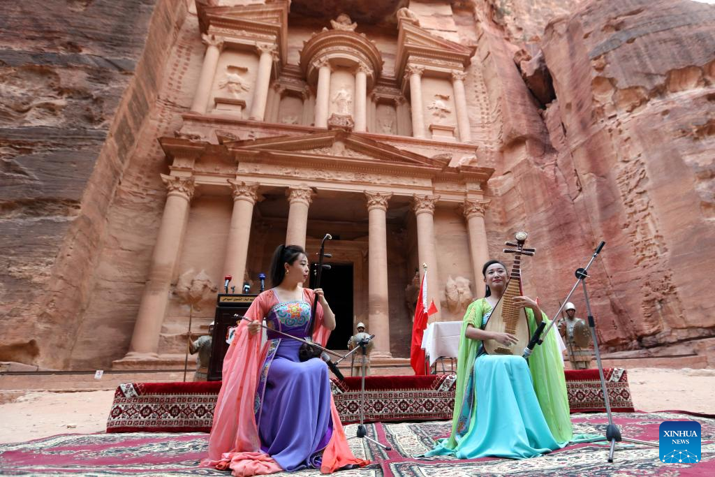Artists perform during the signing ceremony of an agreement on cooperation in culture and tourism between the Chinese city of Jiayuguan and the Jordanian city of Petra, at Petra, Jordan, on May 20, 2025. The agreement signed Tuesday seeks to strengthen the friendly ties between the two historical sites. (Photo by Mohammad Abu Ghosh/Xinhua)