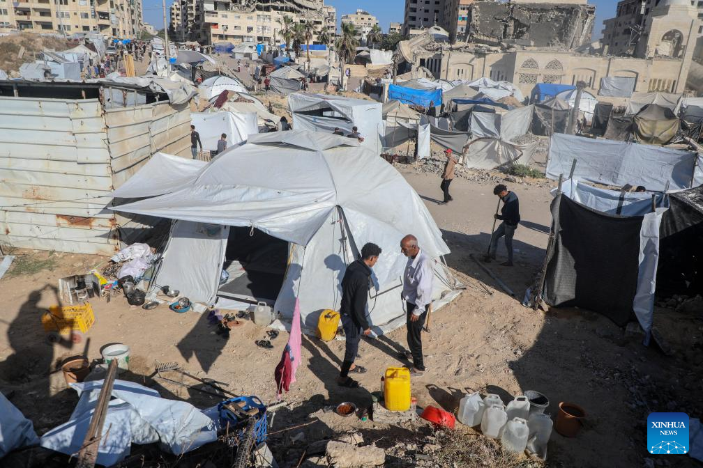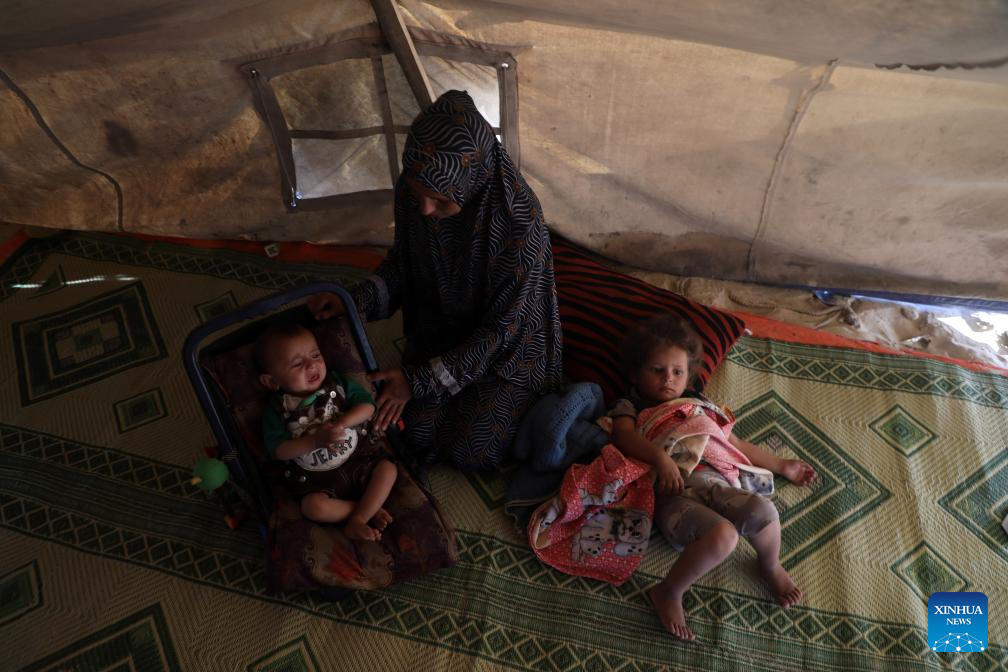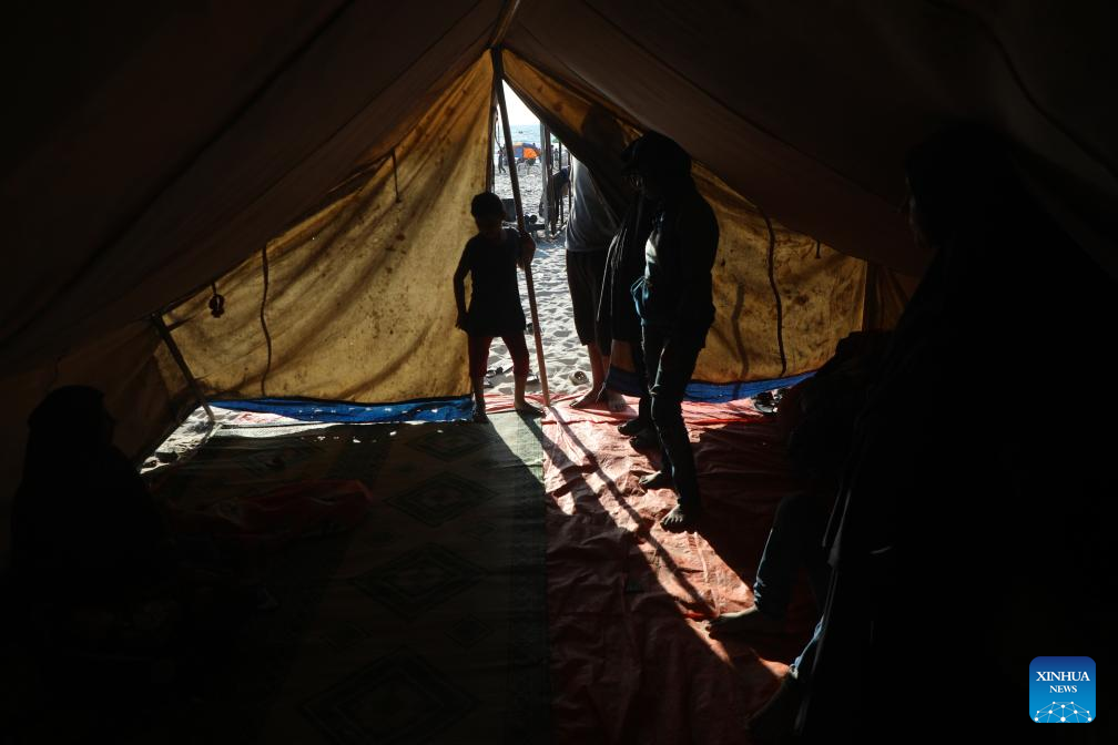 Displaced people are seen inside a tent in the seaport area of western Gaza City, on May 21, 2025. Palestinian President Mahmoud Abbas on Wednesday called on the international community to take immediate action in response to the "catastrophic and tragic" situation in the Gaza Strip. (Photo by Rizek Abdeljawad/Xinhua)