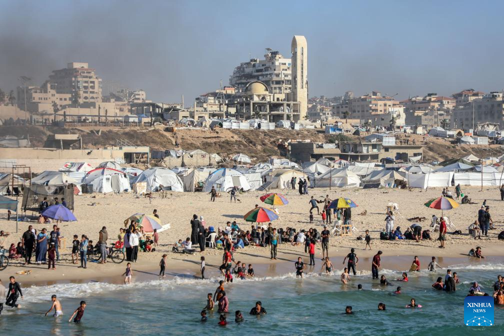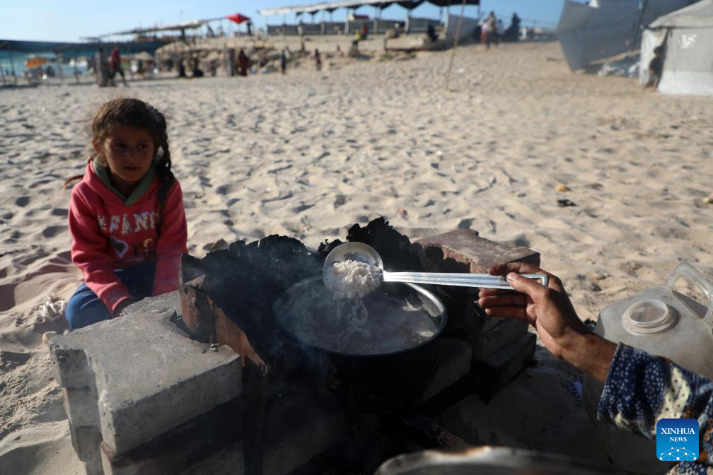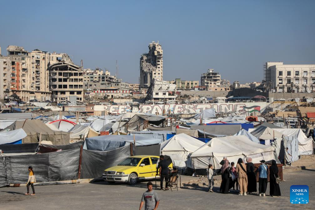 Displaced people are seen at a temporary shelter in the seaport area of western Gaza City, on May 21, 2025. Palestinian President Mahmoud Abbas on Wednesday called on the international community to take immediate action in response to the "catastrophic and tragic" situation in the Gaza Strip. (Photo by Rizek Abdeljawad/Xinhua)